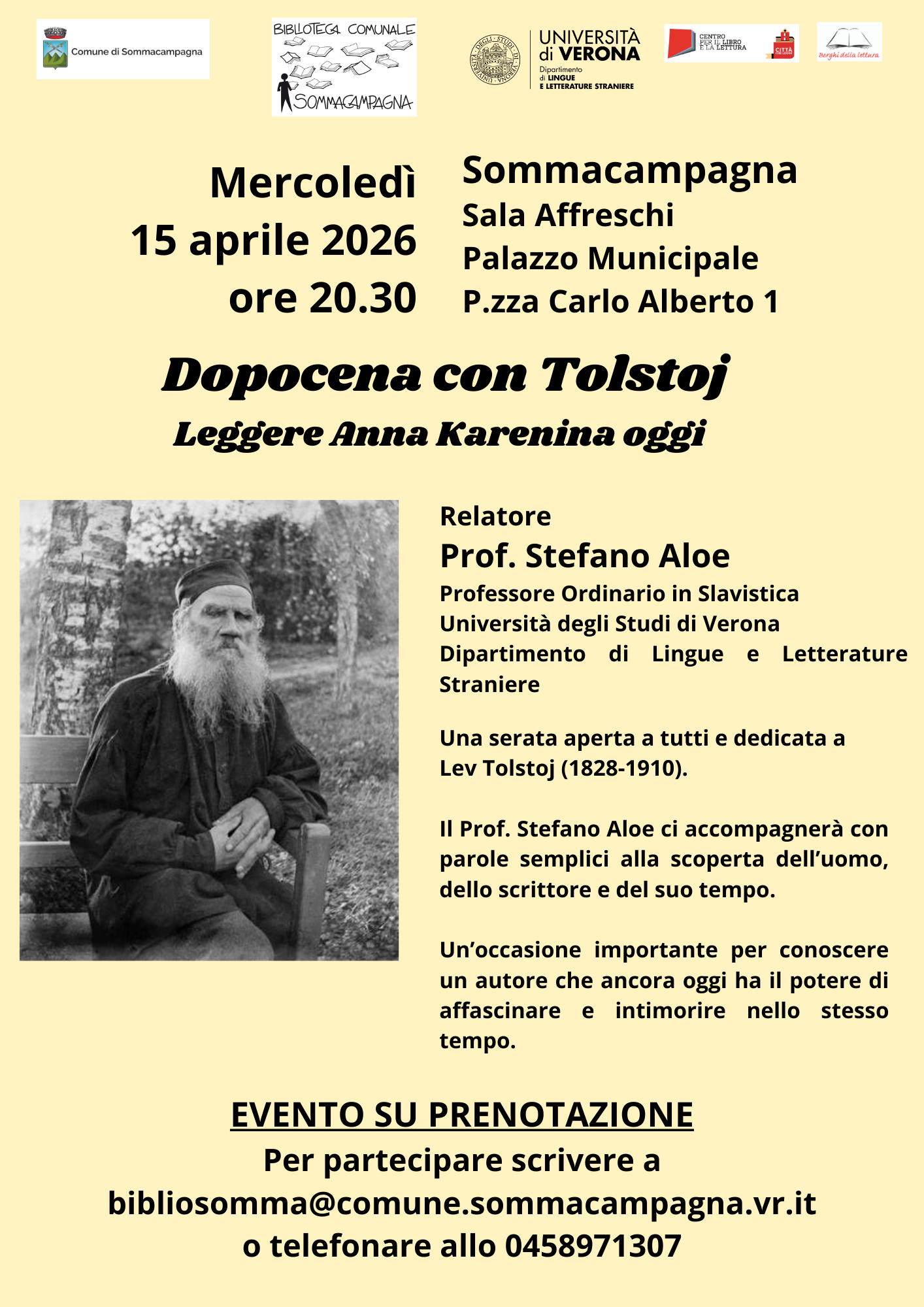 Una serata aperta a tutti e dedicata a Lev Tolstoj - presso Sala Affreschi Municipio - Piazza Carlo Alberto n. 1 - Sommacampagna