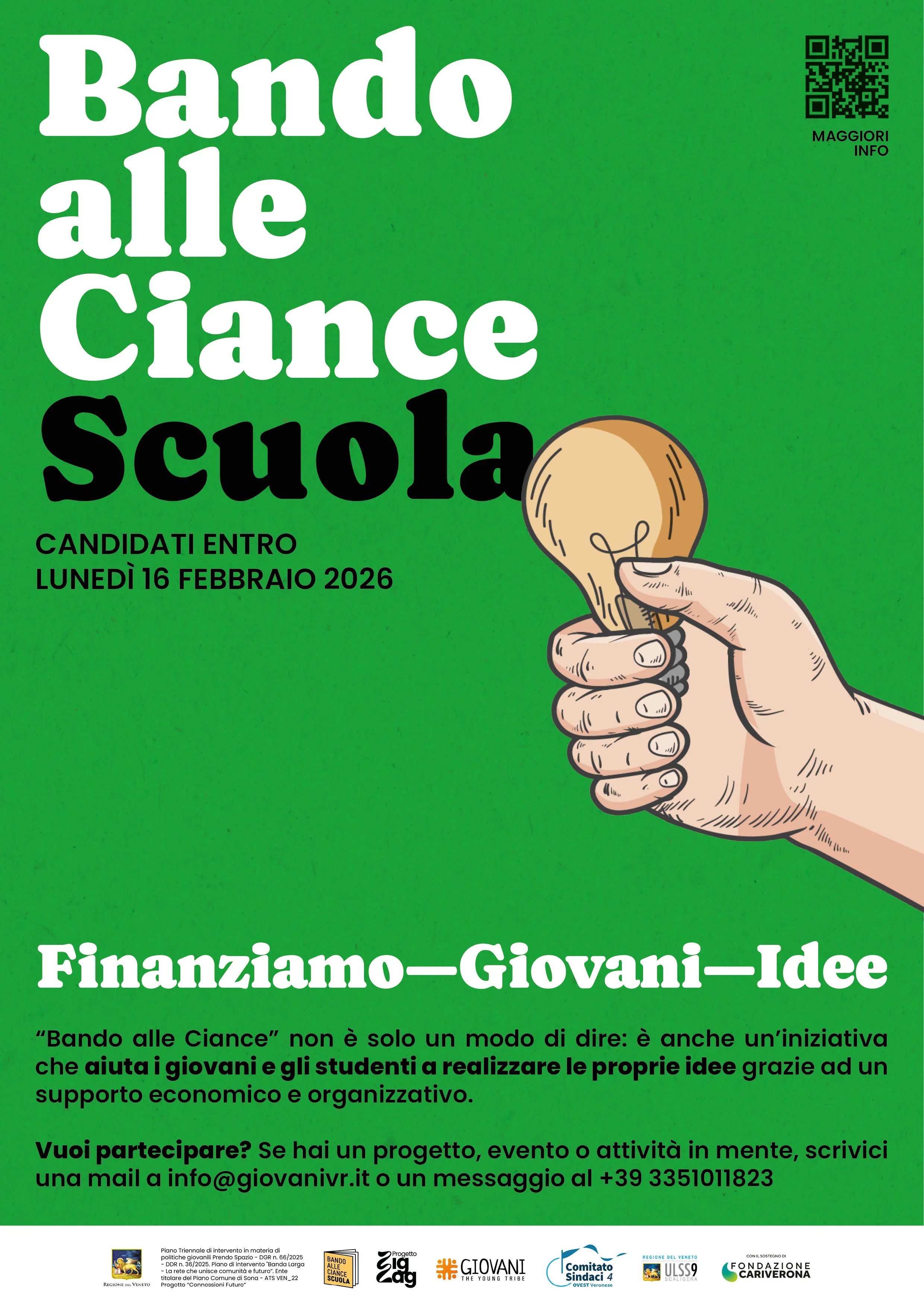 Il progetto “Bando alle Ciance Scuola” è un bando, sul modello di “Bando alle Ciance”, ma dedicato alle scuole e finanziato dalla Regione Veneto con il Progetto Bando alle Ciance Scuola, facente parte del programma Banda Larga – la rete che unisce comunità e futuro, a valere sul Piano Operativo della Regione Veneto “Prendo Spazio” di cui alla DGR n. 66/2025 e all’Intesa del 17 ottobre 2024, rep. 127/CU.