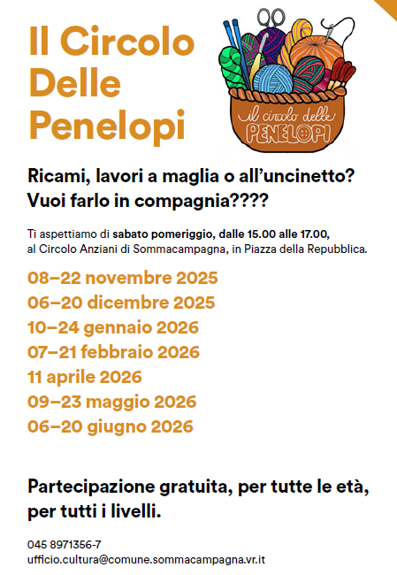 Sabato pomeriggio dalle 15,00 alle 17,00 presso il Circolo Anziani di Sommacampagna, in Piazza della Repubblica.